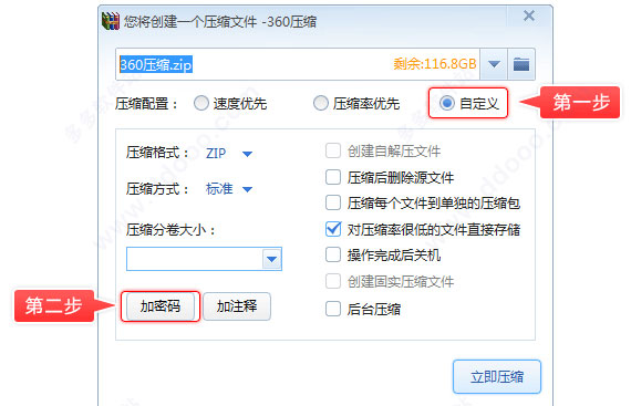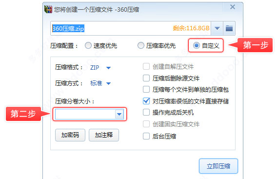 打开360压缩,选中一个或多个文件后,点击软件主界面左上角的【添加】图标,并在新弹出的【您将创建一个压缩文件】窗口中设置好压缩选项后,点击【立即压缩】即可对文件进行压缩。