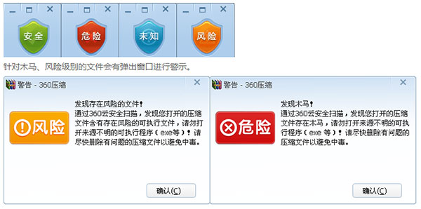 用360压缩打开一个压缩包后,会自动对压缩包内的文件进行云木马检测,保证使用安全。经过云木马检测后,360压缩会对压缩包内不同类型的文件进行安全评级,有效识别木马、脚本、普通文件、风险文件,并在界面右上角会有相应的图片提示。需要说明的是:在安全级别为木马的文件上双击文件会弹出阻止点击对话框,有效防止您误双击打开木马,更安全。 需要说明的是:在安全级别为木马的文件上双击文件会弹出阻止点击对话框,有效防止您误双击打开木马,更安全。