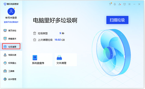 3、点击垃圾清理,可以全面扫描电脑中的垃圾文件,并进行一键清理,释放磁盘空间;