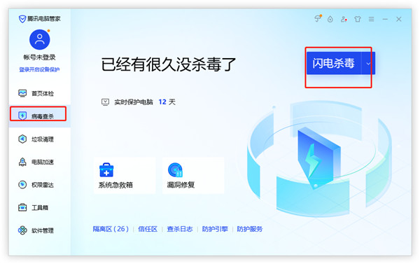 2、点击病毒查查杀,选择闪电查询,即可对电脑进行全面的病毒检测和杀毒处理;