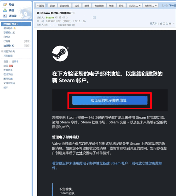 5、登录你的邮箱,验证你的电子邮件,打开steam的验证邮件,点击“验证我的电子邮件地址”这是会跳转到“电子邮件已验证的页面,说明你已经验证成功了。然后返回到客户端,继续完成注册。