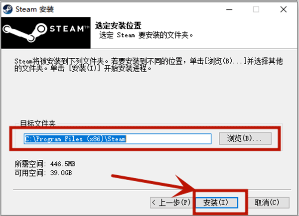 c、选定steam要安装的文件夹后点击安装