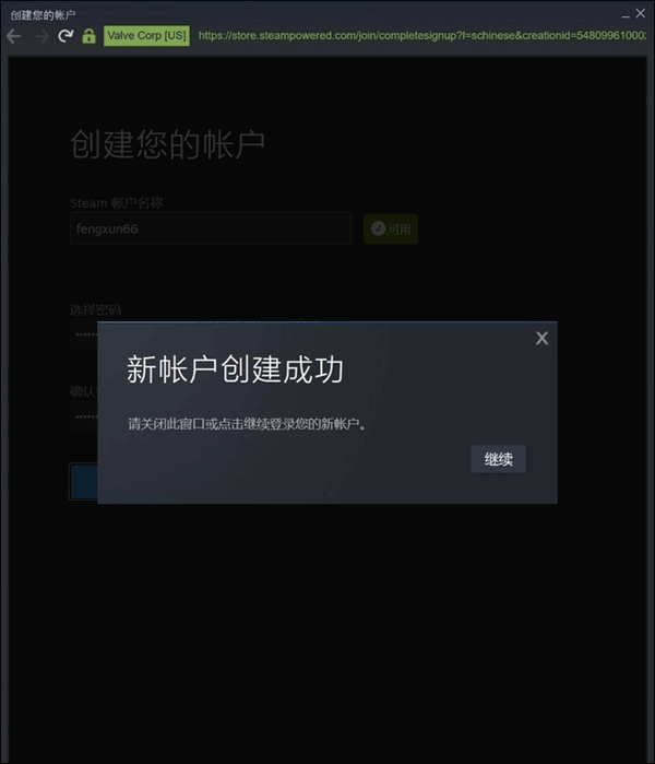 7、这时会提示“新帐户创建成功”点击“继续”就会跳转到登录界面。到此,你就成功的注册了steam账号。现在可以登录畅玩了。