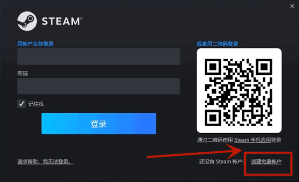 3、安装好后,打开steam,在登录界面,点击创建免费账户。
