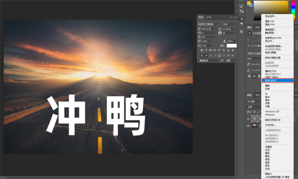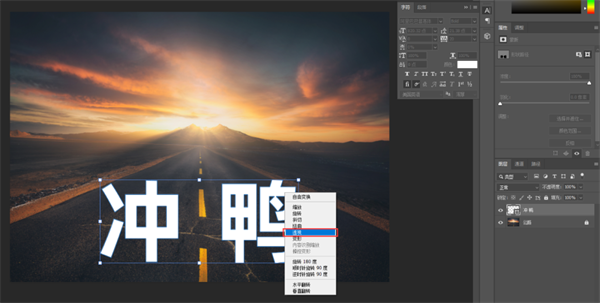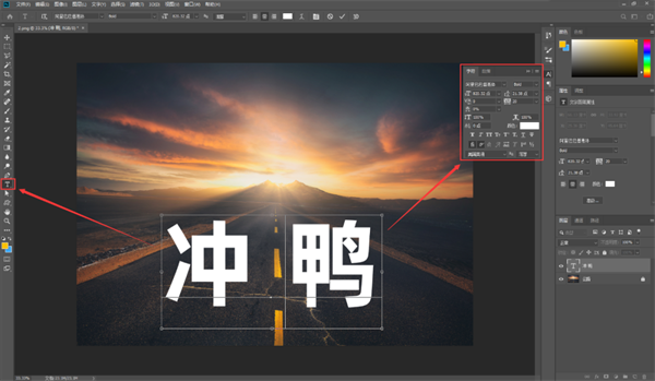 把图片导入PS中之后,选中【文字工具】→在画布上单击鼠标→直接输入文字内容“冲鸭”;在【字符】面板中可设置字体、文字大小等各项参数。在这两个字中间可以敲个空格(当然这是根据实际情况决定的,因为我们要把这两个字分排在公路分界线两边)