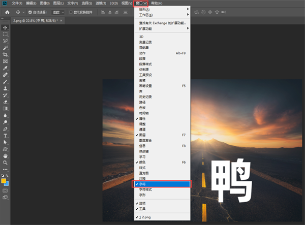 如果大家找不到【字符】面板,在【窗口】选项卡中勾选【字符】即可。