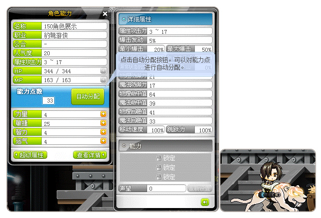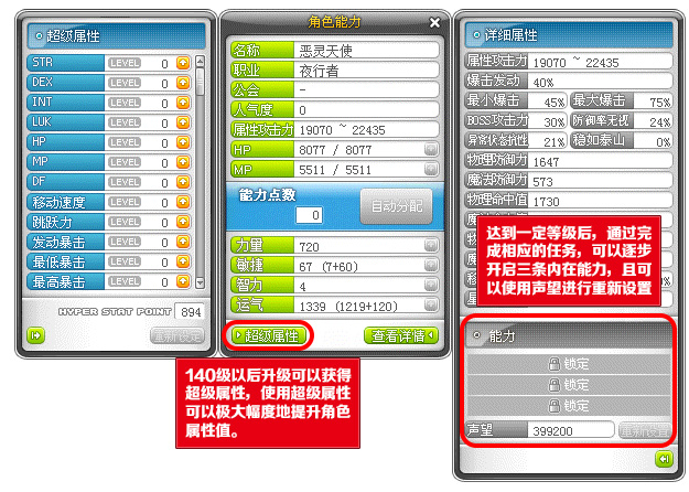 5、能力值窗口显示了当前角色的能力属性值。角色每升一个等级,能力值就会加5点,您可以在能力值窗口根据角色职业自由分配点数。注:在新手状态下,属性点是无法进行分配的。