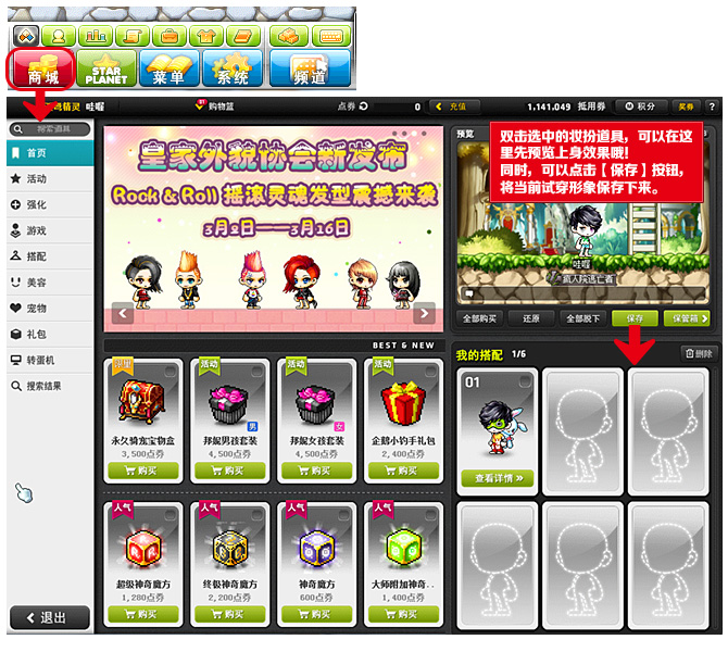 通过游戏下方的【商城】按钮,可以直接进入游戏商城。尽情选择喜欢的妆扮完成华丽变身吧!