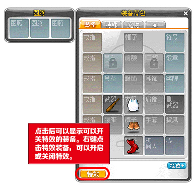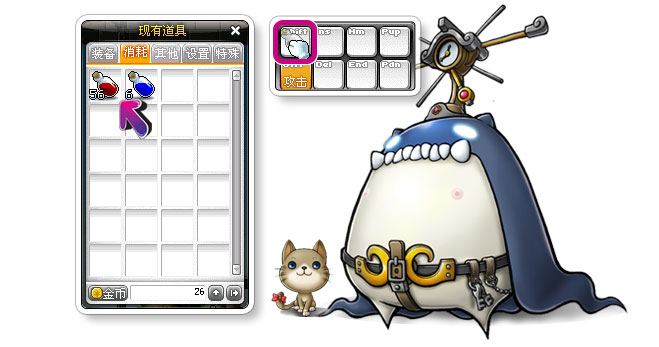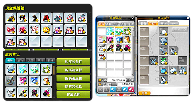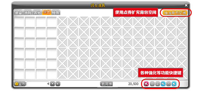 3、道具窗口内分别设有有装备、消耗、设置、其他和特殊5个子窗口。每个子窗口可放置相应数量的物品,当您放置不下物品时您可以选择将物品存储至游戏的仓库内。或是在游戏商城内用点券来扩充相应的窗口数量,以便放置更多的物品。