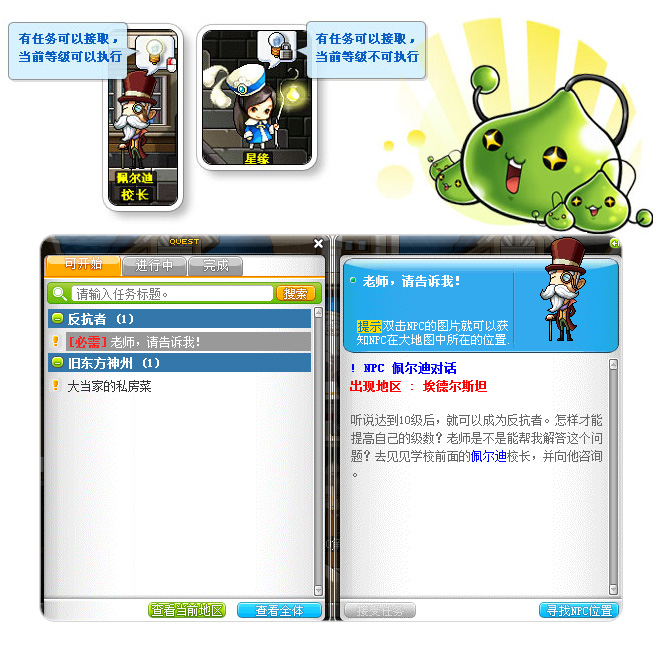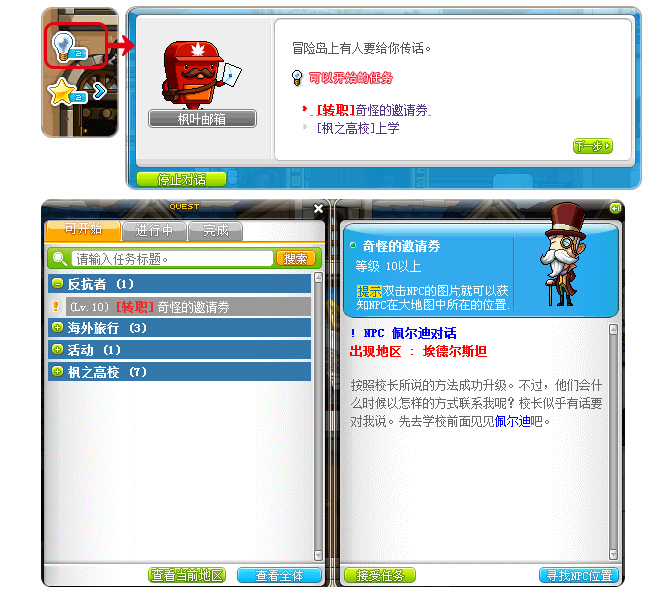 通过灯泡提示,可以接取任务。地图上如果某NPC处有可以接取的任务,他头上会有灯泡提示。同时也可以使用默认快捷键Q打开任务窗口,查看可以开始的任务列表。