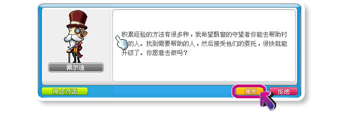 点击NPC进行对话。点击下一步,或者用空格键,后跳出接受任务窗口,点击接受。