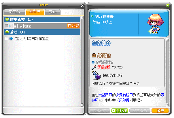 7、任务窗口显示当前角色的任务情况。您可以在这里看到您接受到的任务的标题、等级限制和任务简介。完成的任务会自动分类到已完成任务列表,以区别为未完成任务。