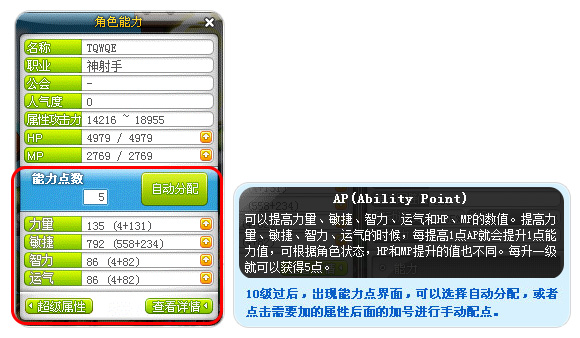 3、10级前系统将自动为您分配所获属性点。10级后可根据职业的不同重新进行手动分配。