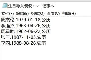 我们支持批量导入 csv 文件格式的生日,可以记事本,新建一个文本文件,按格式填入生日数据后,把 txt 后缀手动修改为 csv 即可。