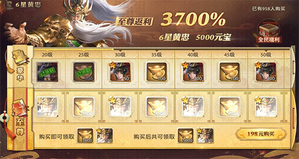 少年三国志零中蜀国的金色武将并不多,其中黄忠就是少有的金色武将之一,玩家可以用他来与赵云、马超等搭配组成五虎将的羁绊,然而获取黄忠的方法比较少,一种是通过高级招募中进行获取,概率极低,另一种就是通过购买返利基金直接进行黄忠的获取,但价格需要198元,非常的昂贵,因此玩家就算是花钱获得了黄忠,但想要对他进行培养和升星还是比较难的,因此大家可以根据自己的经济条件来选择是否购买。