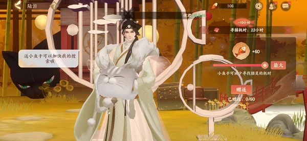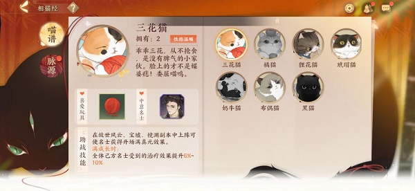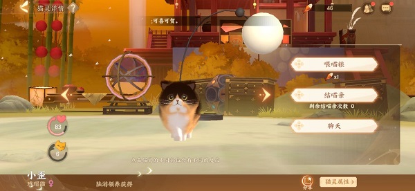 二、猫灵领养随着主线剧情的展开,使君会被赠送一只三花猫,而随后的猫咪就需要陆游去外出寻觅获得,每次耗时24小时,回来后会停留半小时,这期间可以赠送小鱼干礼物来减少等待时间,更有机会获得衔蝉奴等稀有猫灵~