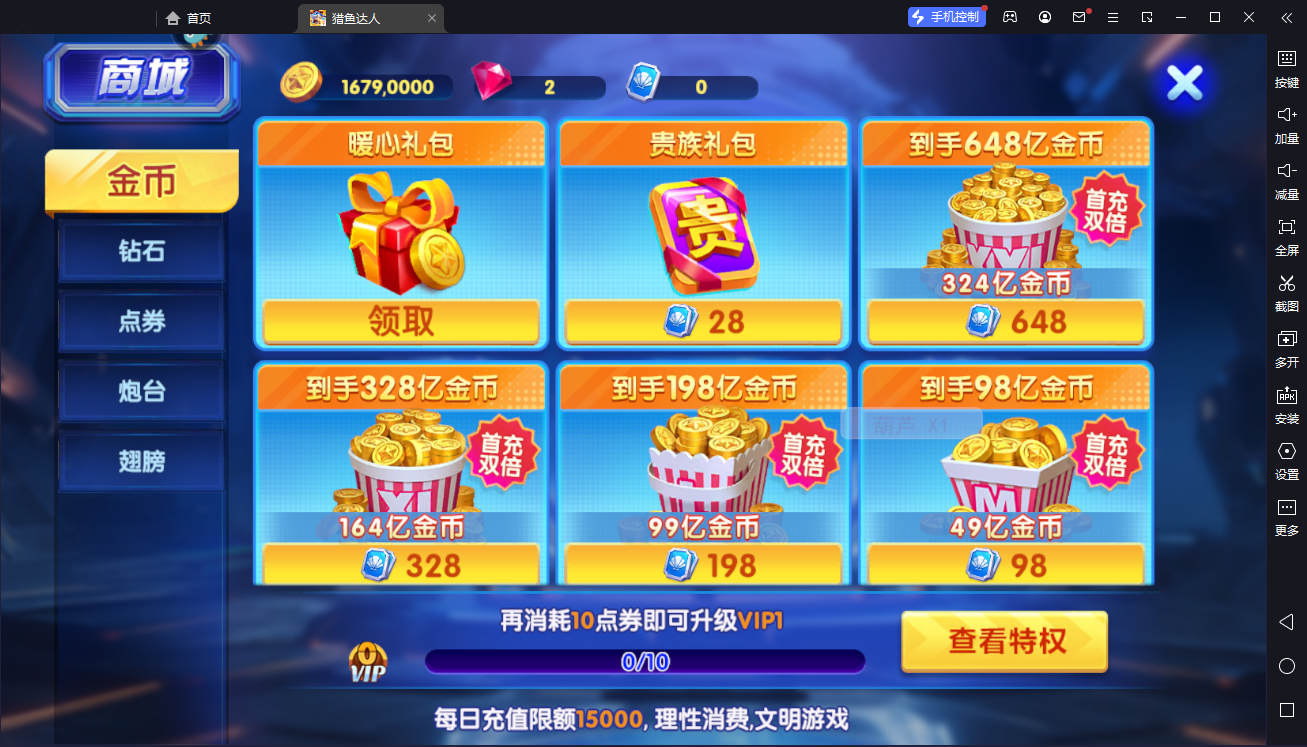 每解锁一级更高倍率的炮台,都需要花费相应数量的钻石。那么,钻石从何而来,最简单的办法莫过于充值。如果只是为了升级倍率,玩家可在充值的同时参加首充活动,不仅能够即可满足升级需求,又能够得到许多系统赠送的礼品,性价比可以说是非常的高。当然,这主要还得看大家的消费心态,觉得值就充,反之也有别的方法可以代替。