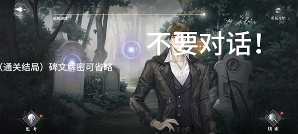 接着与柏源对话"询问其身份"—"分享调查名单"—"走进"墓园深处—墓碑处"查看碑文",解密过程如下图