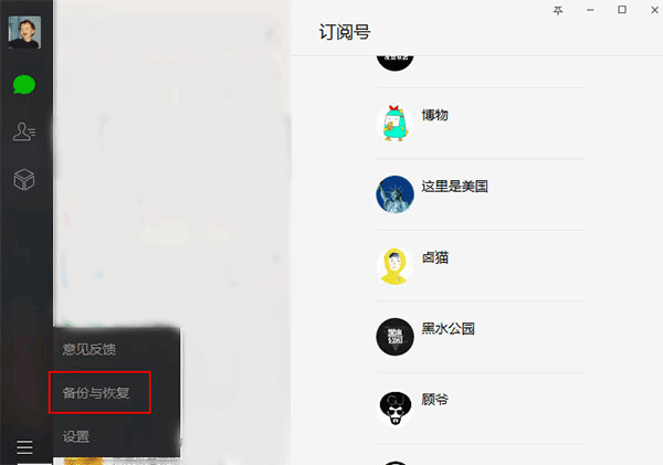 1、打开安装好的微信,打开软件后,点击左下角的三个横杠图标,在弹出的选项中点击【备份与恢复】。