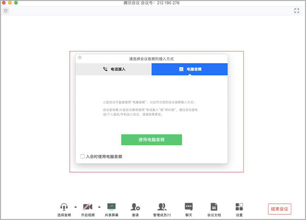 1、当您进入会议中后,会提示您选择音频接入方式;