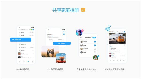 - 创建共享相册,邀请好友加入,赋予好友不同的管理权限(上传,下载,转发)。