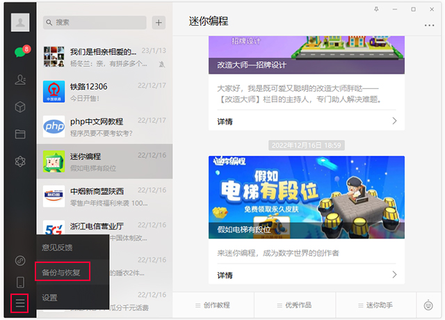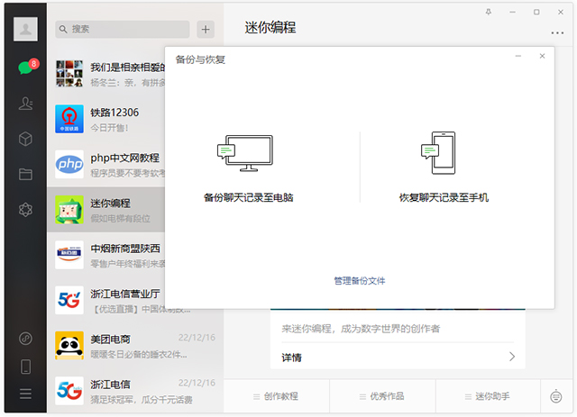 聊天记录备份与恢复功能可以将手机微信上的聊天记录备份到电脑。也可将已经备份到电脑上的聊天记录恢复到手机中。