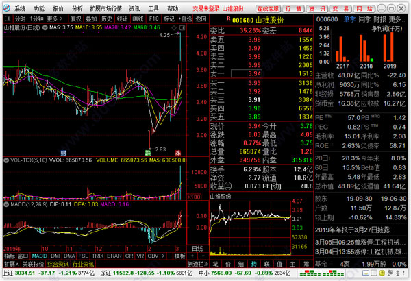 5、比如输入000680,可以查看单支股票的走势图,现价,涨跌,总量,外盘,换手率,主营收等信息;