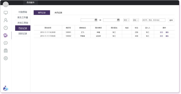 1、工作台为今日工作管理,主要处理今日预约,跟踪患者就医情况,安排、更新患者就医流程极具便利;同时具有新建患者、新建预约快捷入口,以及患者详情入口。