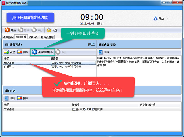 2、真正的即时播报功能,失物招领、广播寻人…临时插播游刃有余;