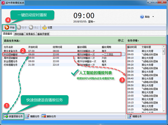 1、全天候自动定时播报,事先规划好的促销内容都在这里;