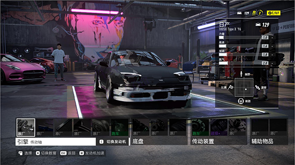 车辆性能包括了引擎、底盘、传动、辅助四大分类,这分类之下囊括了传动轴、ECU、冷却、排气管、涡轮增压、氮气、悬挂、刹车、车胎、差速器、变速器、离合器的更改。玩家可以选择更换整体大分类也可以选择更改单个小零件。