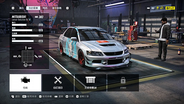 本作玩家可以随时随地的使用tab切除车辆改装界面而不用前往指定的车库进行更改。车辆的性能能在右侧的表单中直接看到,同时车辆目前性能适合的赛事类型也会在表单下方的定位表中显示。