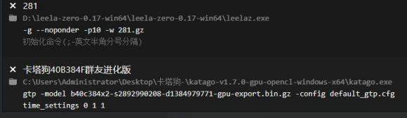 用Sabak加载卡塔狗,第一行和第二行和加载leela zero大致相同。但第三行的参数要注意,不论权重是gz格式还是txt格式,权重前面一定要有-model,还要加载卡塔狗的配置文件,就在katago.exe上方,引擎的更新和不同作者写的引擎,配置文件名不一样,配置文件前一定要加-config。
