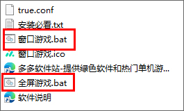 2、在解压文件下找到并运行如下图所示的“窗口游戏.bat”或者“全屏游戏.bat”即可完美运行游戏。(切记:在运行游戏后不要关闭其他进程,以免导致游戏闪退)