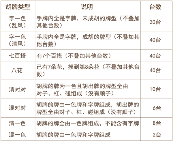 *胡牌要求满足胡牌的基本牌型,同时要求台数至少为5台。游戏结束后,根据胡牌台数确定输赢的倍数。