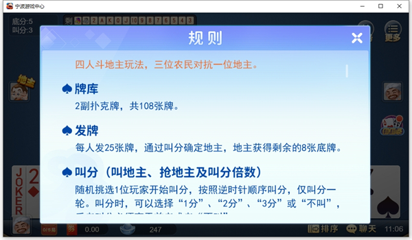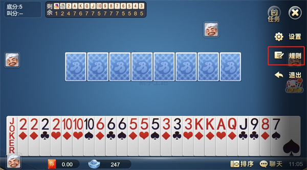 采用四人地主模式,规则特色:两王必包、王可百搭、单顺不可出、两连对不可出。