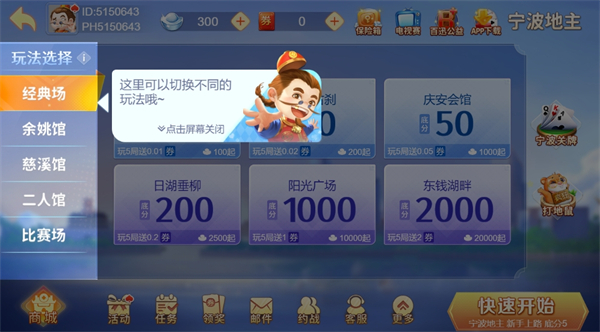 5、比如我们点击宁波地主,里面提供经典场、余姚馆、慈溪馆、二人馆、比赛场等玩法,点击新手开局;