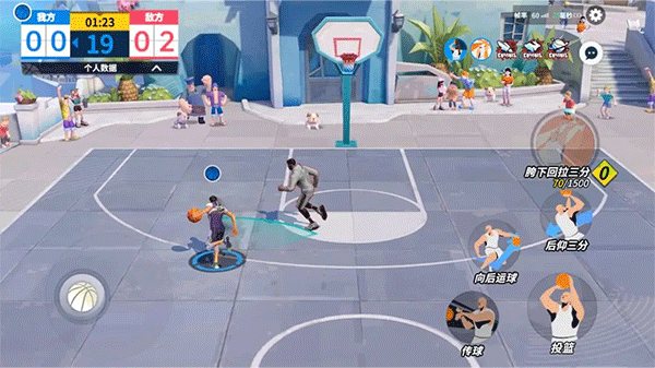 游戏规则也挺有意思的,比如每次进攻前必须过三分线才能算有效进攻,单局只有3分钟,节奏特别快,得分多的一方就能赢。技能按键设计得很清晰,有传球、突破、投篮这些基础操作,还有爆发技这种大招,关键时刻用起来特别爽。