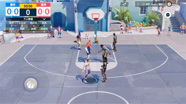 《全明星街球派对》的场地仅占用标准篮球场的一半,攻防转换时,场地上的三分线会闪烁提示,如果不出三分线,则无法进行进攻。