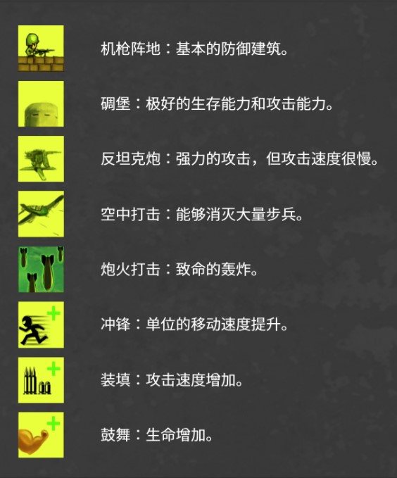如图所示,游戏界面底部展示的是您的控制条,在这里您能选择建造防御,派遣士兵,或者提供支援。