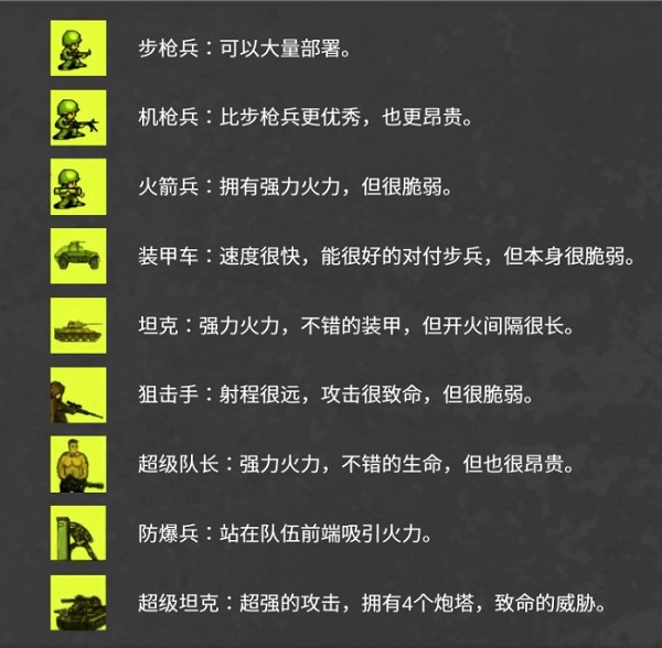 装甲车:速度很快,能很好的对付步兵,但本身很脆弱。