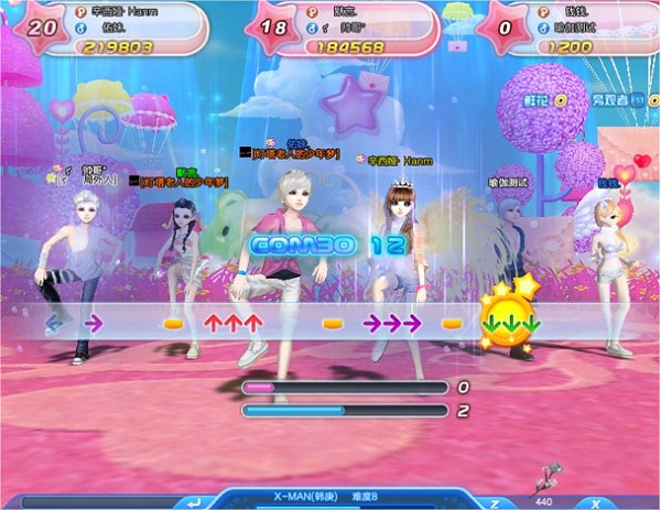 这是默认的对局模式,支持4键和8键形式。在炫舞模式中,玩家可以体验到传统和节奏两种操作方式。在歌曲比较柔和的部分将使用上下左右传统音感输入方式操作,当进入到歌曲的高潮部分时,画面会提示进入“specialshow”段落。此时需要正确输入不断向右滚动进入判定框中的节奏音符。两种操作方式切换时,连P和COMBO数的累计将会被中断。四键按方向,8键按数字键。上下左右是8246,另四个方向是7913。