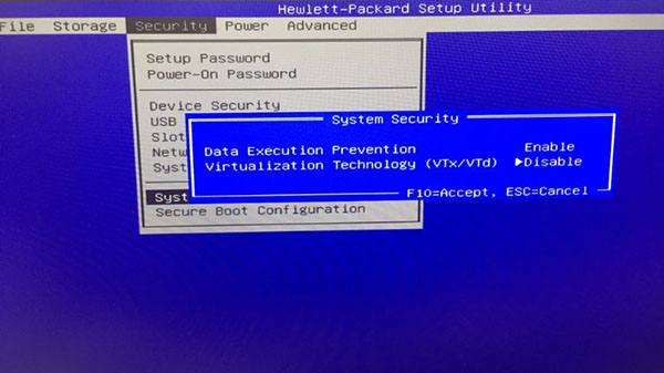 选择security(安全)后再选择system security(系统安全)就可以找到VT选项了,按回车(enter)改成enabled之后按F10保存即可