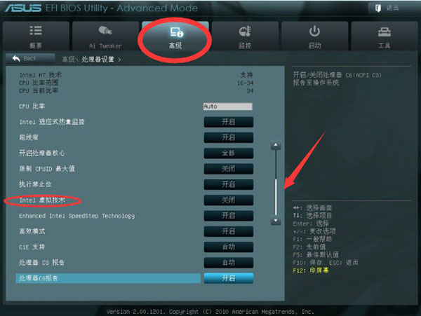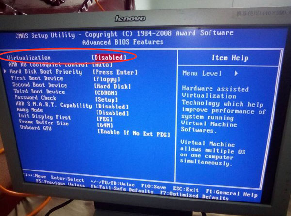 按“←”,“→”,“↑”,“↓”切换到virtualization选项,按“Enter”选中修改成enabled,按F10保存