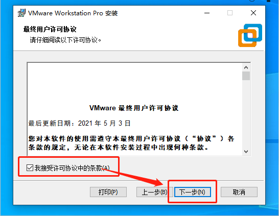 2、首先双击运行"VMware-workstation-full-16.0.0-16894299.exe"程序,接受软件安装协议;