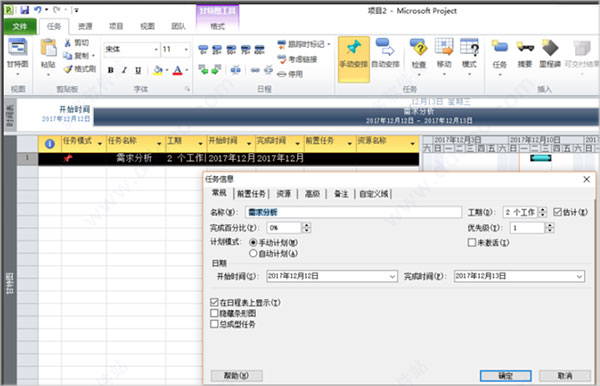 2、或者您也可以双击单元格,打开任务信息就窗口,在任务信息界面中输入任务名称,您还可以修改其他的选项修改完成后点击【确定】;