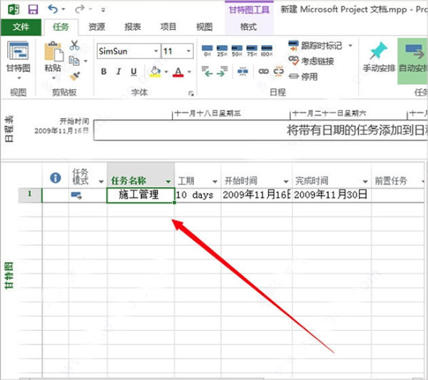 1、打开新建的project2010项目,点击任务名称单元格,新建第一个主任务;