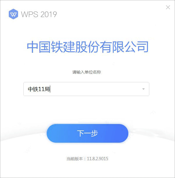2、双击运行"WPS中铁定制版.exe"程序,输入单位名称这里,可随意选择;