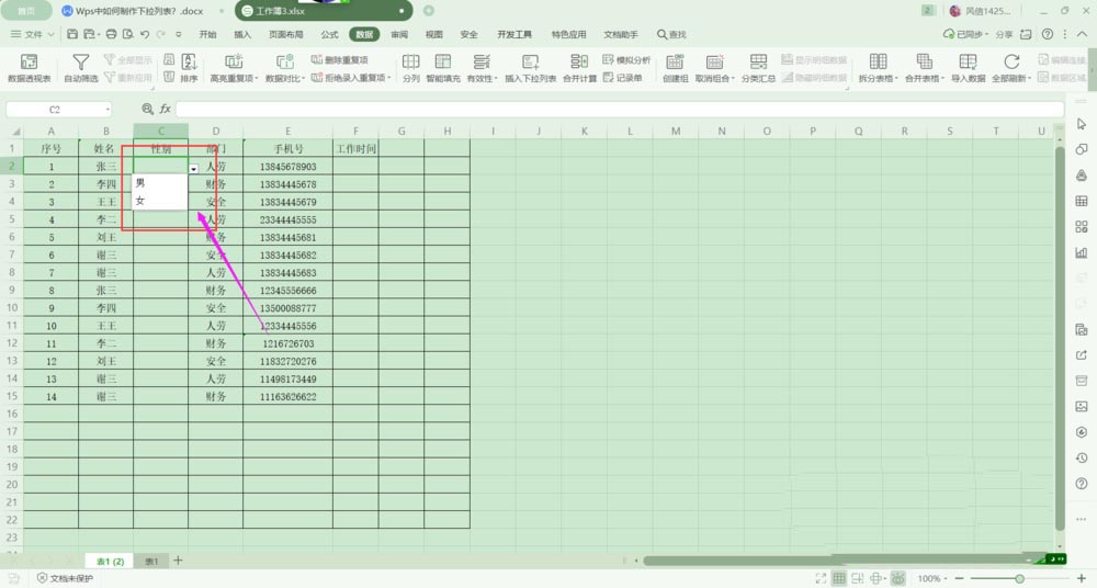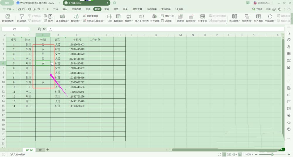 7、下拉选项设置好后,任意单击设置下拉列表的单元格,可以看到单元格的右边有下拉图标,单击下拉图标后,可以看设置的下拉选项内容,如下图所示: