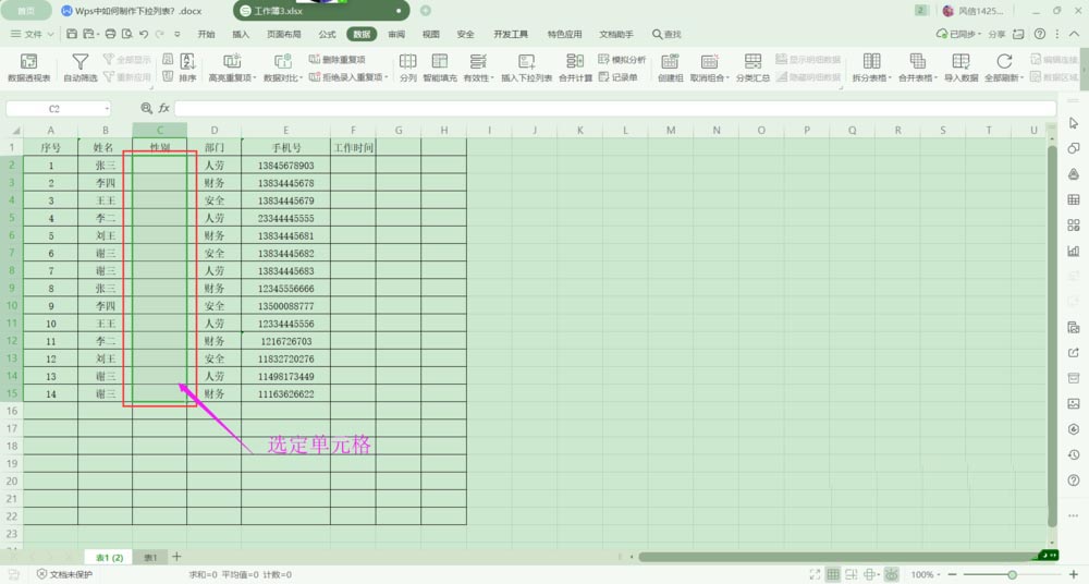 1、拖动鼠标,选定需要设置下拉列表的单元格,如下图所示: